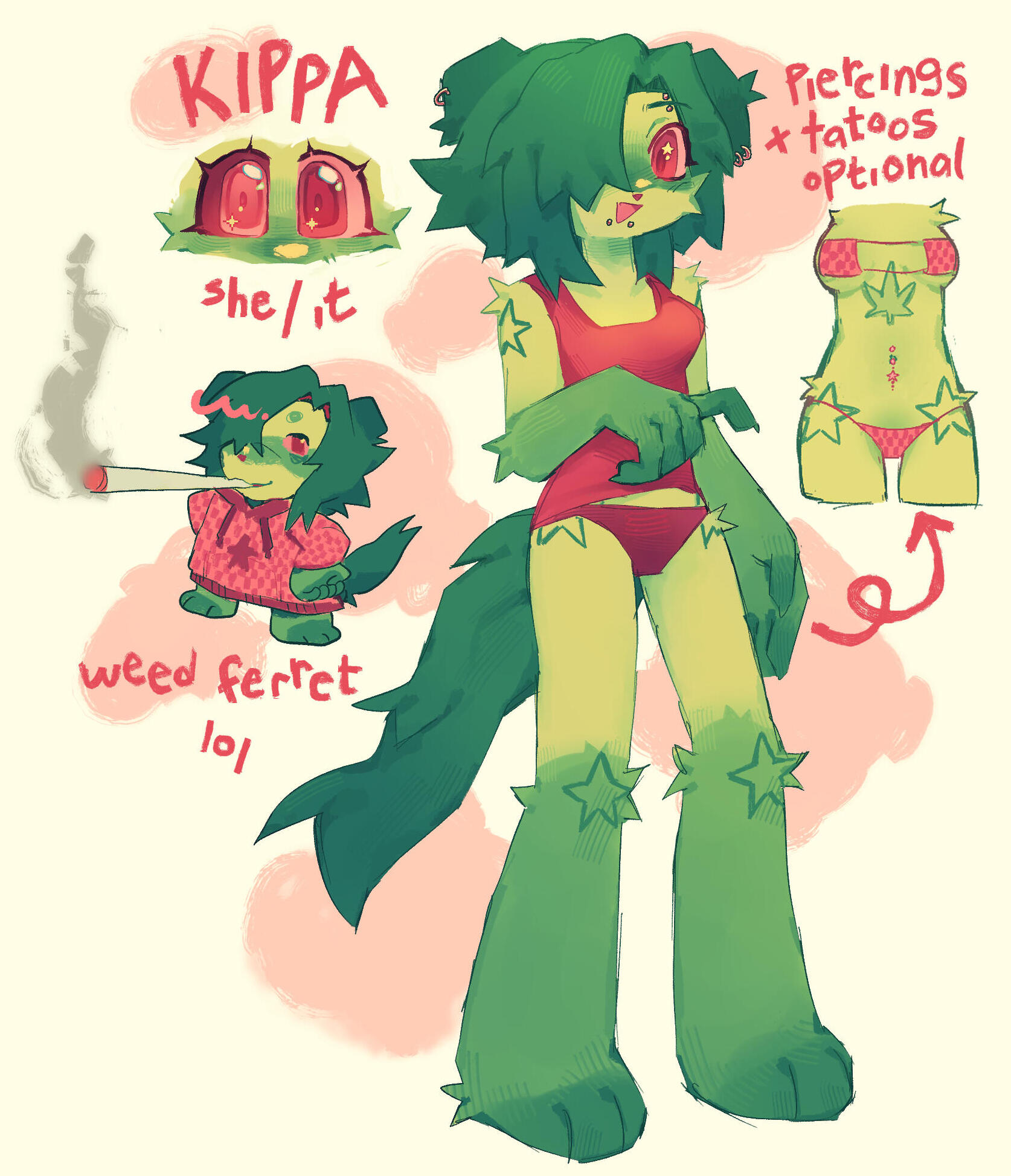 a clean, unshaded fullbody of your character, and an additional headshot/chibi/outfit/etc, along with their name and basic information.